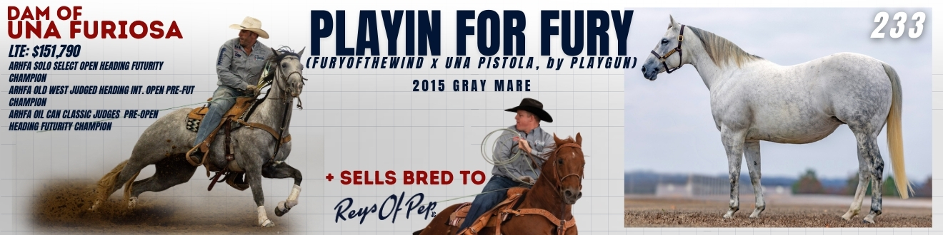 Playin For Fury is the dam of UNA FURIOSA, earner of $151,790 and 17 AQHA points, including wins at the ARHFA Solo Select Judged Open Heading Futurity, the ARHFA Old West Judged Heading Intermediate Open Pre-Futurity, and the ARHFA Oil Can Classic Judged Pre-Open Heading Futurity. He has also been a consistent finalist and check earner across major judged heading events, establishing her as a mare that produces horses capable of winning at the highest level of the futurity system.