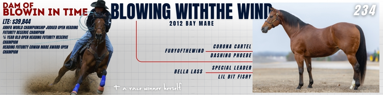 Blowing Withthe Wind is a proven producer with eight AQHA foals and a top-producing record led by BLOWIN IN TIME, earner of $39,844. Her resume includes the ARHFA World Championship Judged Open Heading Futurity Reserve Championship, and multiple Reserve Champion finishes in 3/4-Year-Old and Open Heading Futurity events.