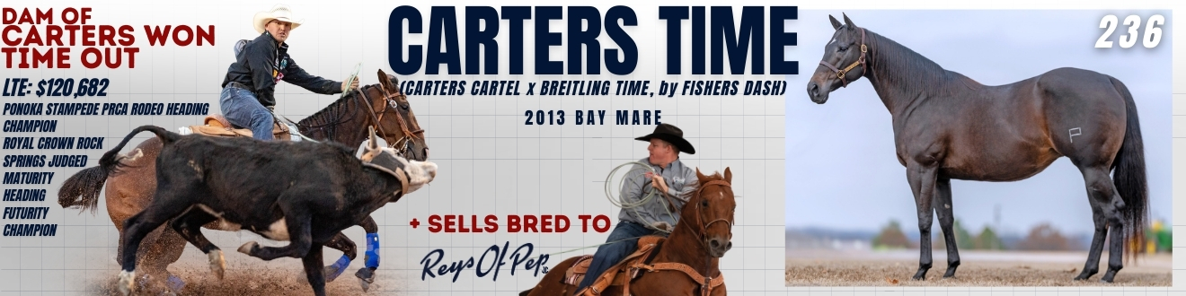 Carters Time is the dam of CARTERS WON TIME OUT, earner of $120,682, including a Ponoka Stampede PRCA Rodeo Heading Championship and a Royal Crown Rock Springs Judged 6-Under Open Heading Futurity Championship, transitioning seamlessly from the futurity arena to professional rodeo. These results confirm her ability to convert a speed pedigree into a high-level rope horse performer.
