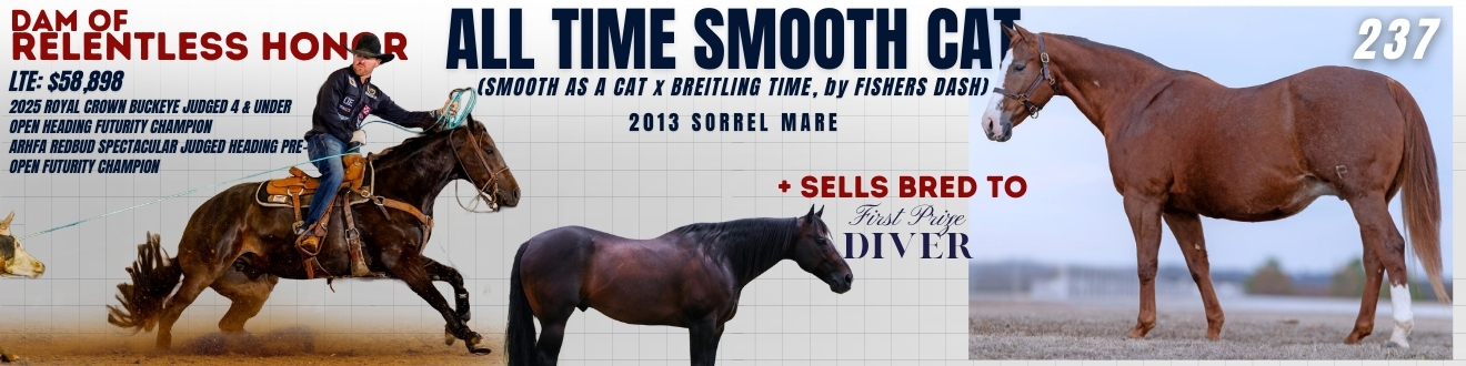 All Time Smooth Cat is the dam of Relentlesss Remuda mare, RELENTLESS HONOR, earner of $58,898 and 24.5 AQHA points, including wins at the Royal Crown Buckeye Judged 4-Under Open Heading Futurity and the ARHFA Redbud Spectacular Judged Heading Pre-Open Futurity, along with additional finalist finishes at the 6-Under level.