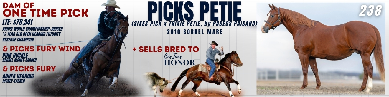 She is the dam of ONE TIME PICK, earner of $78,341, including ARHFA World Championship Judged 3/4-Year-Old Open Heading Futurity Reserve Champion, Royal Crown Buckeye Judged 4-Under Open Heading Futurity Champion, and Gold Buckle World Finals Judged Heading Open Maturity Reserve Champion.
