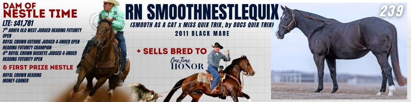 RN Smoothnestlequix is the dam of NESTLE TIME, earner of $41,781, including a seventh-place finish at the ARHFA Old West Judged Heading Futurity Open, Champion honors at the Royal Crown Guthrie Judged 4-Under Open Heading Futurity, and additional placings at Royal Crown Buckeye events.