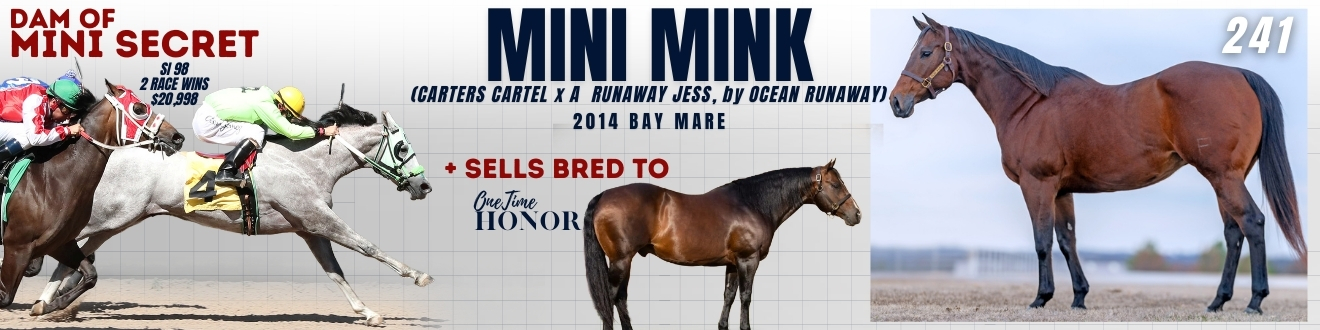 Mini Mink is the dam of MINI SECRET SI 98, a two-time race winner with earnings of $20,998. Her produce reflects speed, athleticism, and consistency, with foals that fit both racing and performance programs.