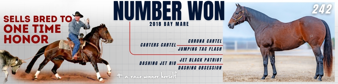 Number Won is a younger broodmare with a race foundation and a performance-oriented pedigree. She is herself a race winner with earnings of $7,620, and her dam, Dashing Jet Rio, is a proven producer of race and performance earners.