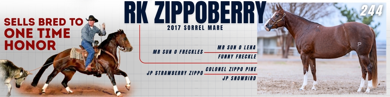 RK Zippoberry is a newer broodmare but comes from a pedigree rooted in cow sense and rideability. Mr Sun O Freckles brings NRCHA-proven influence, while Colonel Zippo Pine anchors the dam side with a line known for consistency and soundness.