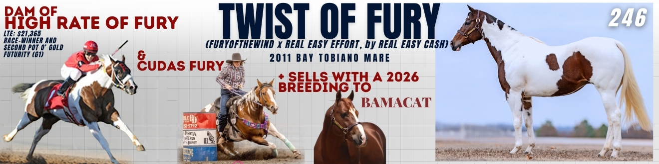 Twist Of Fury is a proven producing mare with six foals, five of which have raced. Her produce includes HIGH RATE OF FURY SI 91, a race winner and $21,365 earner, and additional performers across barrel futurity and regional open competition.